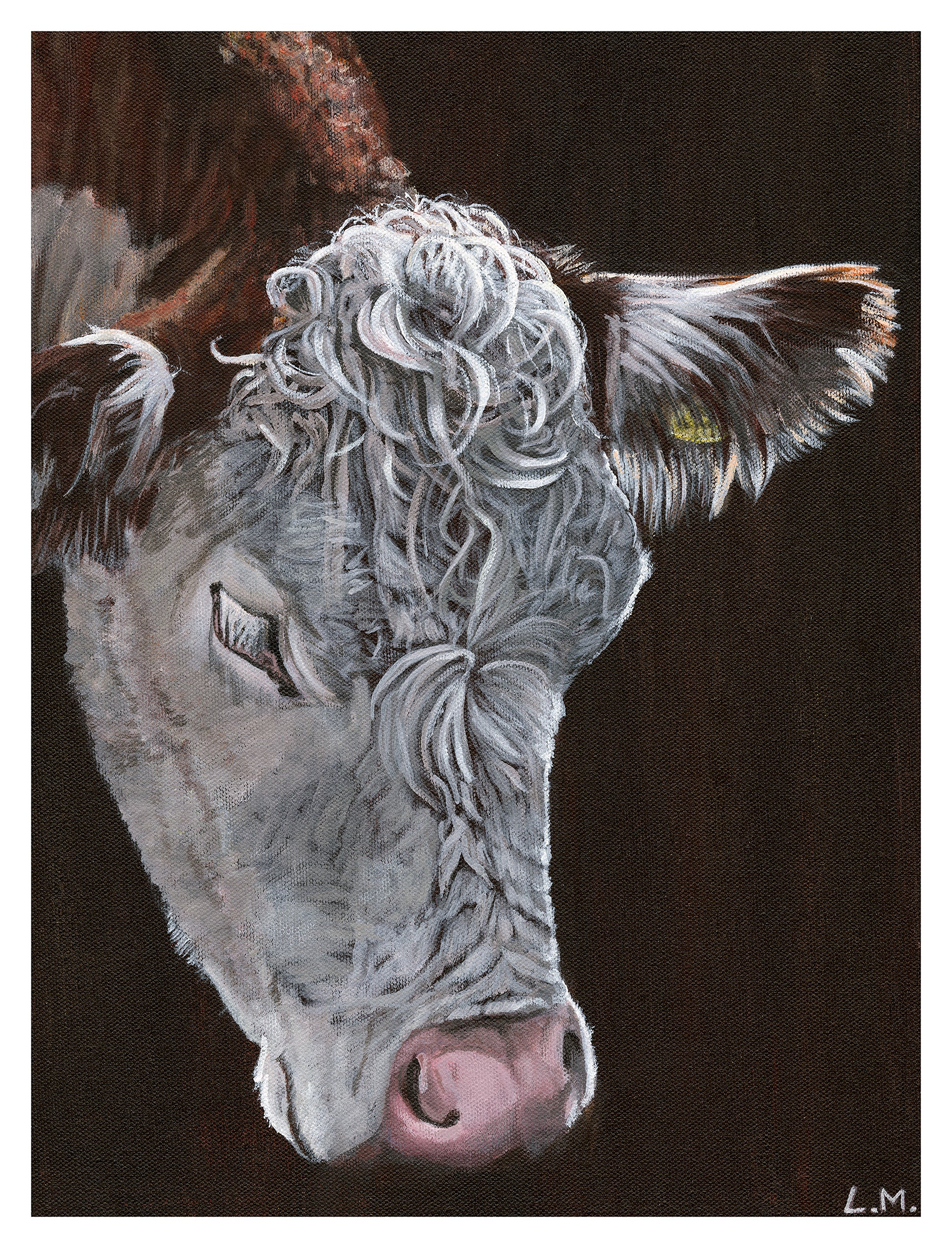 The original acrylic painting is of a beautiful Hereford cow in Wiltshire, UK. It was a drizzly day making their coats even more distinctively curly.